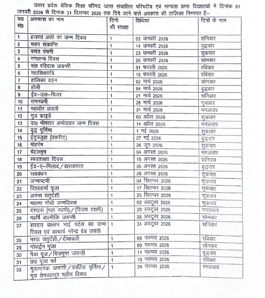 🛑🔎 उत्तर प्रदेश बेसिक शिक्षा परिषद (UP Basic Shiksha) द्वारा परिषदीय व मान्यता प्राप्त बेसिक (प्राइमरी व जूनियर) स्कूलों के लिए नए शैक्षणिक सत्र 2026 का अवकाश सूची 🗓आधिकारिक रूप से प्रकाशित किया जा चुका है। सूची के अनुसार , Read More …